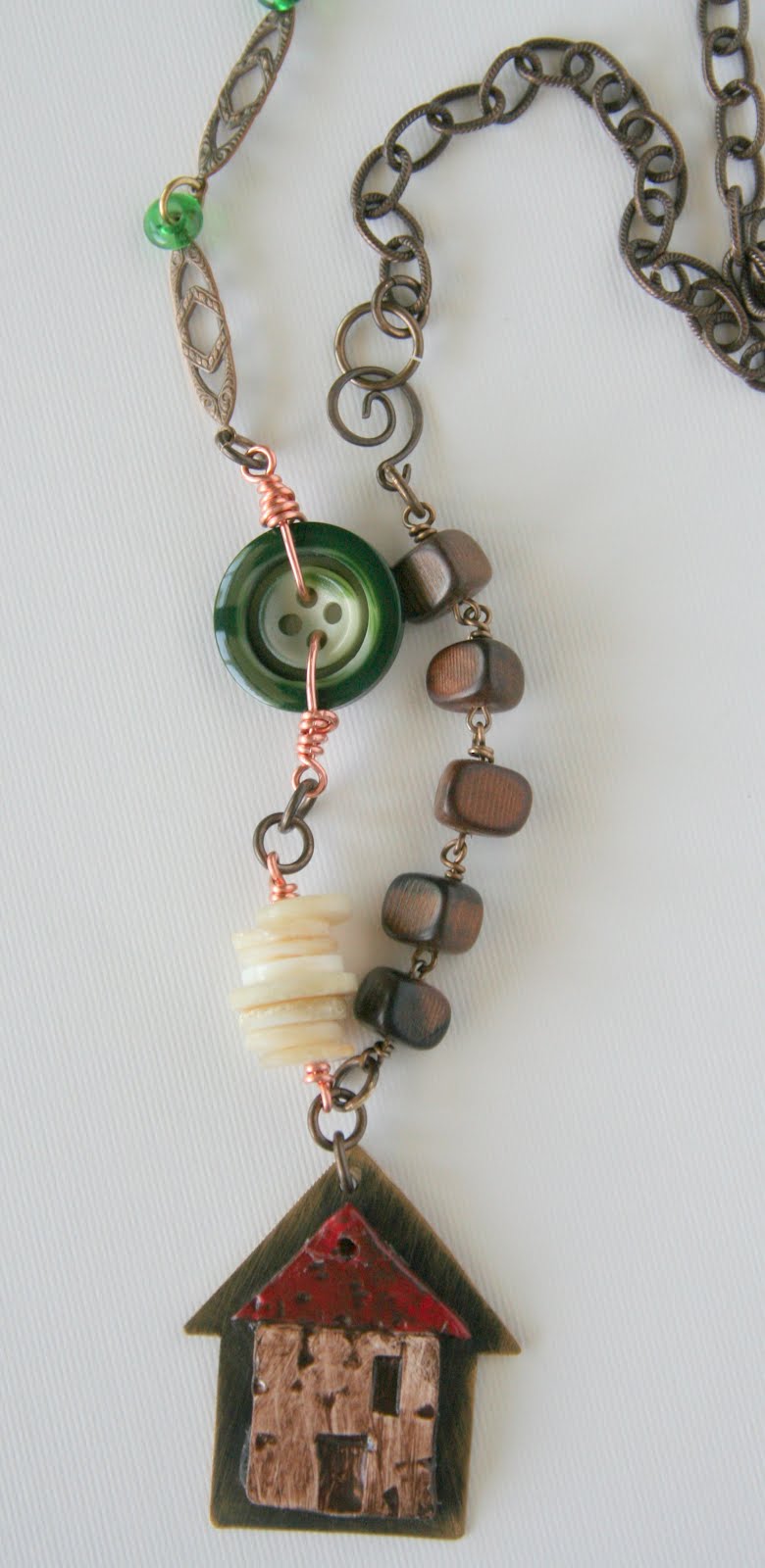 This piece includes lampwork beads by Twinstar, a drilled river rock I snatched from the Sisterhood of the Traveling Bead Box, a Vintaj Brass Sand Dollar, sterling clasp, and silver filled wire.